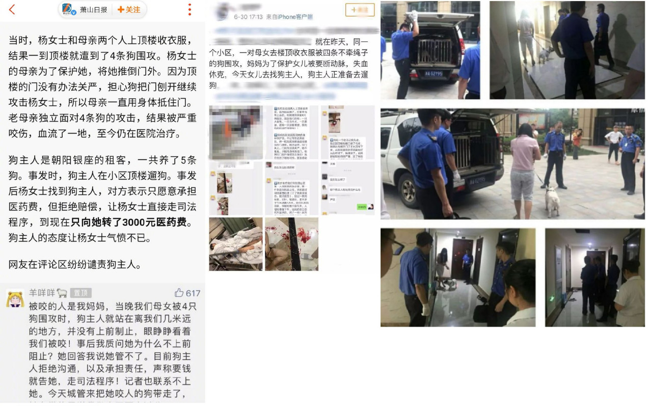 据新闻媒体报道,2019年6月28日,杭州萧山某小区内,一对母女上顶楼收衣服时,突遭四条狗围攻。其中母亲右脚被狗咬伤动脉,由于失血过多,出现休克症状。据悉,当时狗主人就站在几米远的地方,却没有阻止。虽然有物业、城管介入,狗主人也不以为然,只同意承担医药费而拒绝赔偿。目前,狗主人涉嫌违规养犬,被立案处理。咬人的斗牛犬已经被执行注射死亡处理,城管责令狗主人将其余犬只迁往别处饲养,并将对狗主人罚款3000-5000元。